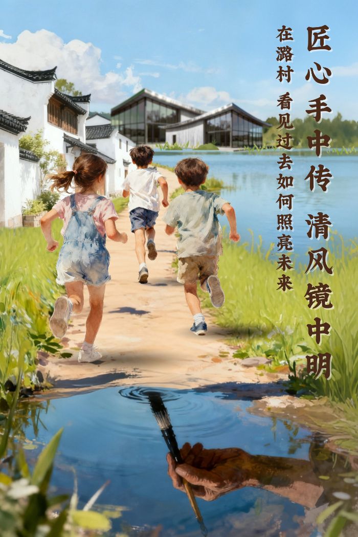 第三幅海报《古今相映·清风不绝》采用了创新的镜像构图。画面上半部分实写老师傅教导年轻人制作湖笔的场景,下半部分的"倒影"却幻化成了潞村今日的美丽景象。这种巧妙的构图象征着技艺与精神的代际传承,以及传统文化对现代乡村建设的滋养。