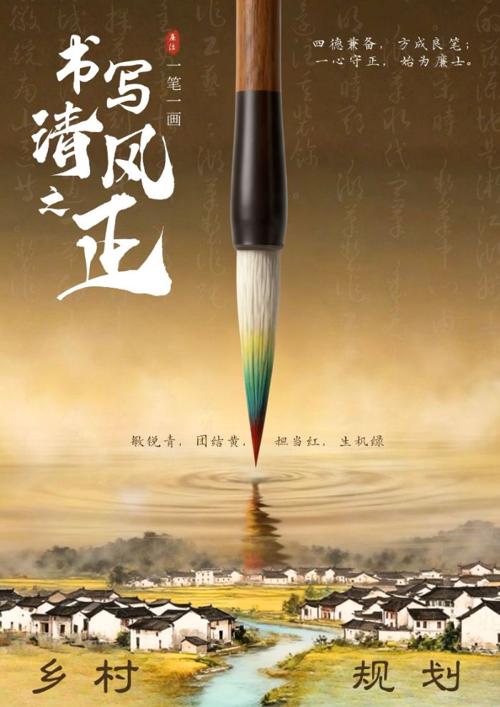 第二幅海报《笔之正·心之尺》则展现了一支巨大的湖笔,笔杆挺直,矗立在潞村的山水之间。特别的是,笔毫蘸取的不是墨色,而是青、黄、红、绿四种纯净的色彩,正在一幅代表"乡村规划"的卷轴上作画。这四种色彩分别对应湖笔"尖、齐、圆、健"四德,寓意着干部应具备的品格。