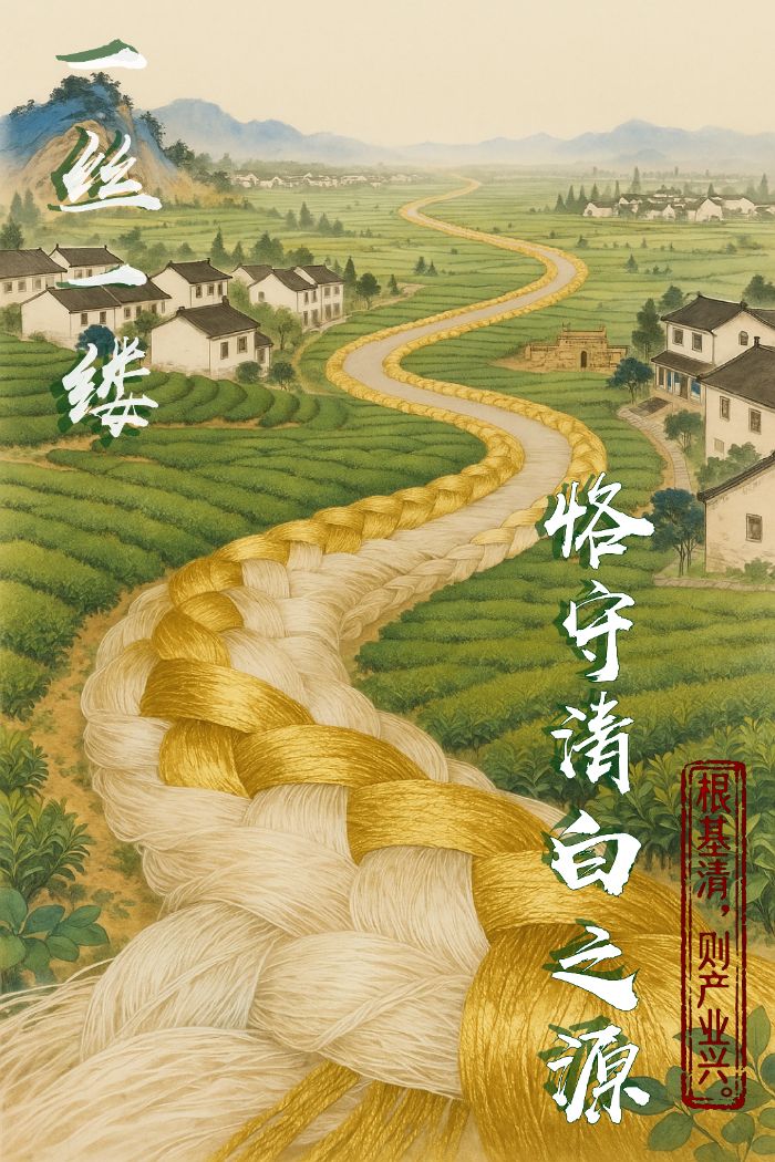 第一幅海报《丝之源·廉之始》以一条由金色蚕丝编织的"丝绸之路"为主视觉,这条路从古老的钱山漾遗址延伸出来,蜿蜒穿过青翠的现代茶园与民居,通向远方。设计团队解释:"这条丝路象征着廉