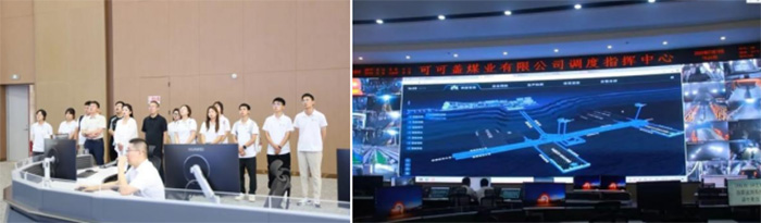 在智能调度中心,工作人员向实践团介绍道,“可可盖煤业公司运用5G技术实现了井上、井下关键设备高速互联、高效互通及智能控制”,并现场对综合管控平台如何让采煤、运输、通风等各环节的实时数据实现互联与集中监控进行了演示和讲解。