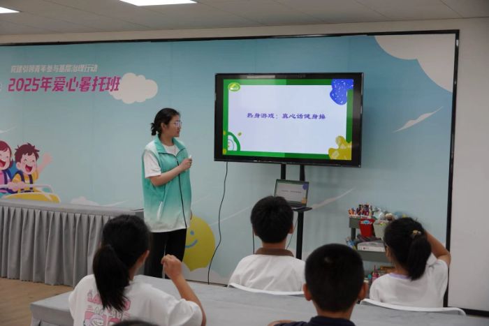 图为社区孩子们积极配合完成“真心话健身操”游戏。 裴春蕾 陈天乐供