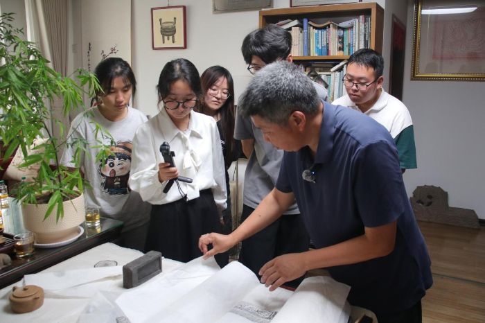 在访谈环节,徐伟先生从家族传承脉络讲起,细致讲述了徐氏传拓从祖辈初创到如今的发展历程,他提到,传拓看似是简单的“复制”,实则暗含对文物的敬畏——不同材质的石碑、青铜器,需要搭配不同韧性的纸张和调制比例的墨汁,甚至连捶打的力度都要根据纹路深浅精准把控,稍有不慎便可能损伤文物原貌。这些藏在细节里的讲究,让队员们第一次意识到,这项技艺不仅是手艺,更是对历史遗存的温柔守护。