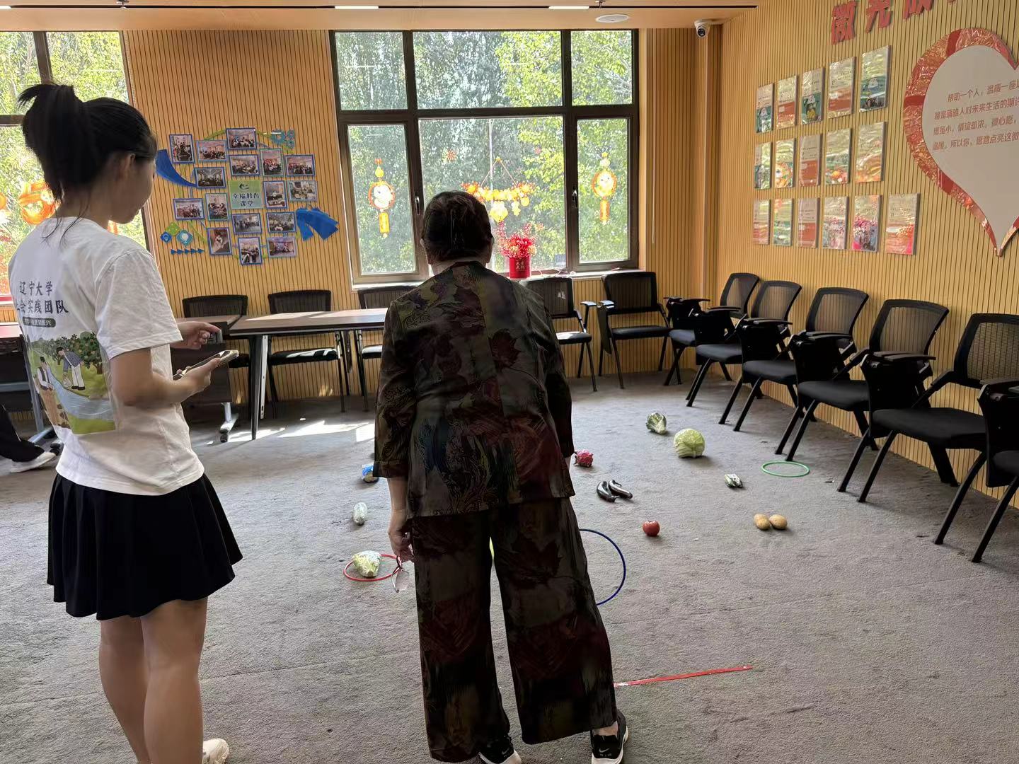图为团队成员与老年人进行“果蔬套圈”活动