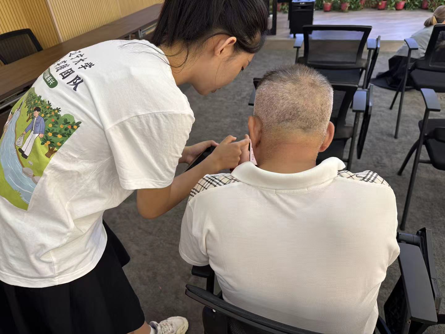 活动当天,“助老智联小分队”成员刚抵达社区活动中心,便迅速搭建起简易教学场地进行仔细地讲解。“阿姨,您平时用手机是不是总找不到调字体大小的地方?我教您。”“叔叔,您说想给孙子发照片,咱们现在就一步步操作。”团队成员主动上前与老年人交流,用亲切的语言、缓慢的语速,拉近与老人们的距离。