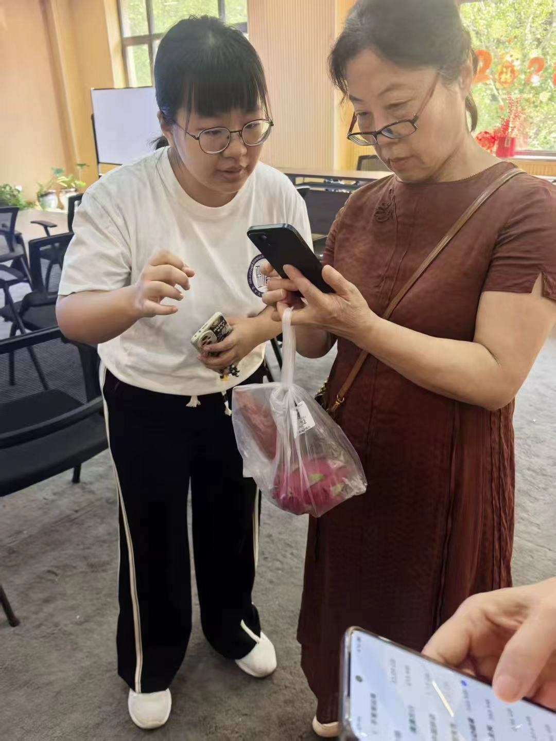 宣讲结束后,为了帮助老年人巩固所学知识,团队精心设计了“果蔬套圈”互动环节——成功回答一个问题即可获得五个套圈,只需回答对卡片上的问题,就能获得新鲜的水果和蔬菜。“请问如何在手机通讯录中添加新的联系人啊?”“想自己的孩子们时,你知道如何打视频电话看看他们吗?”面对问题,老人们积极思考,有的还主动向身边的团队成员求助,现场氛围热烈而温馨。这种“趣味游戏+知识巩固”的模式,不仅让老人们在轻松的氛围中加深了对操作步骤的记忆,更激发了他们主动学习智能设备的兴趣。