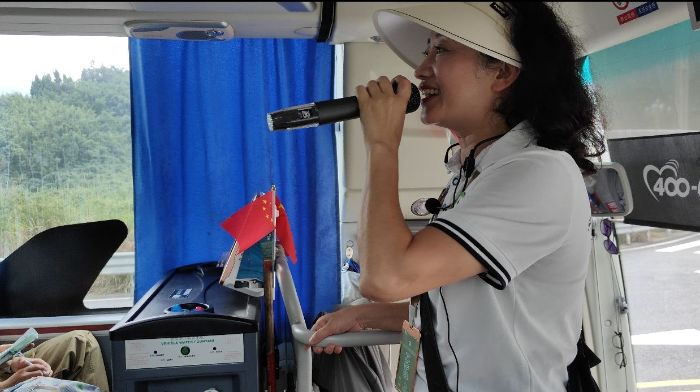 到了我们的观光车上,志愿者拿起话筒,给大家详细介绍各个景区景点,绘声绘色的描绘着景区的美丽,并且耐心为大家解答疑惑。对于一些晕车或不适的游客,志愿者会无私的将自己的储备物资拿出来提供给游客,安抚游客的同时并与调度中心进行沟通。