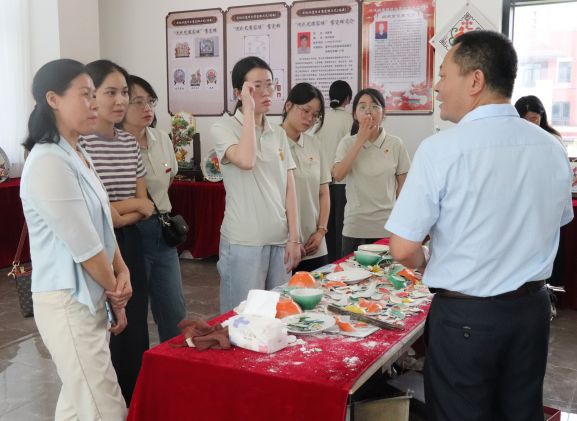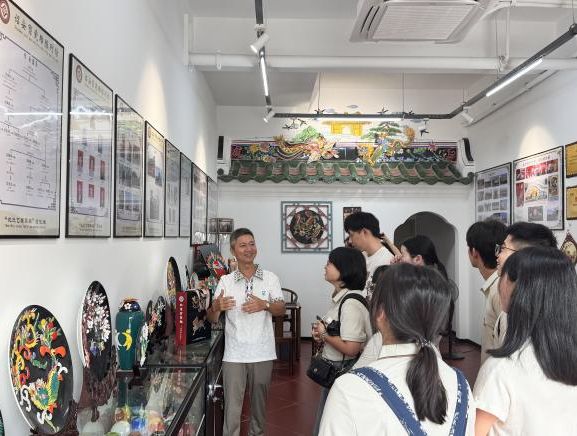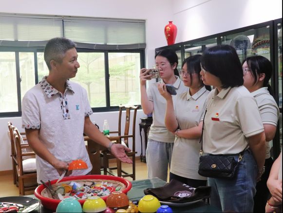 在诏安文化艺术中心非遗展馆,诏安县博物馆馆长许焜武为实践队员们讲述剪瓷雕的历史渊源、制作流程及其独特的地域文化特色,并介绍了诏安非遗产业及剪瓷雕相关的扶持举措,使队员们真切感受到了当地文旅部门在非遗保护与传承上所做的努力,也对剪瓷雕这项传统工艺的当代发展有了更立体的认识。