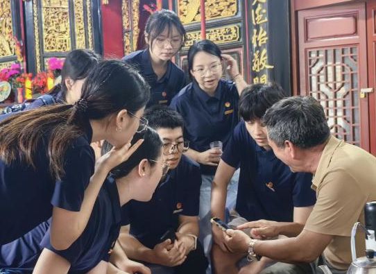 在剪瓷雕陈列馆与沈氏大宗祠“饗保堂”,福建省省级剪瓷雕工艺(诏安)第五代传承人沈锡仁与队员们展开了一场传统与现代的深入对话。陈列馆内,沈老师不仅向队员们解析剪瓷雕技艺的技术精髓,更分享了他将人工智能技术与传统技艺融合的创新构想,展现出非遗传承人立足传统、开拓创新的前瞻视野。实践队员小汤表示,“沈老师对艺术的热忱,对传统工艺传承发展的深刻思考,让我对非物质文化遗产的保护与创新有了全新的认识。”