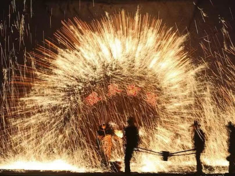 打树花,感受勇敢者的艺术。除了剪纸,蔚县还有一项传承五百余年的古老绝技——打树花。该项技艺不仅是河北“省级非物质文化遗产”,2021年更入选国家级非物质文化遗产代表性项目名录扩展项目名录。其起源可追溯至明代,当时贫苦的铁匠们因无力购买烟花,便以废铁熔化成水,泼洒城墙迸发火花,这一充满智慧的创造逐渐演变为元宵祈福的民俗盛事,被誉为“勇敢者的艺术”。表演现场,铁匠将1600℃高温的铁水泼洒至古城墙,铁水遇冷炸裂,迸溅出万朵金红色火花,形成“火树金花不夜天”的奇景。