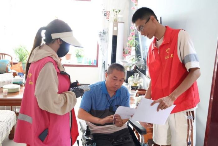 图为实践团队员与第三师图木舒克市167社区访谈居民对电信诈骗的了解度。李雨蒙 供图